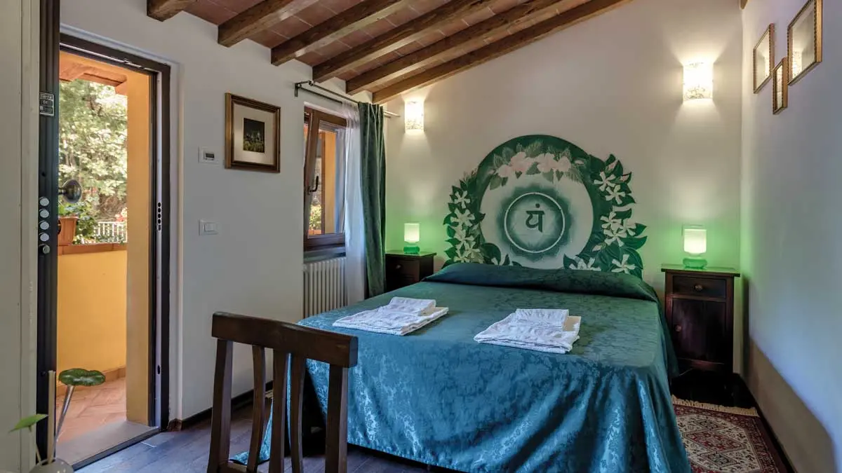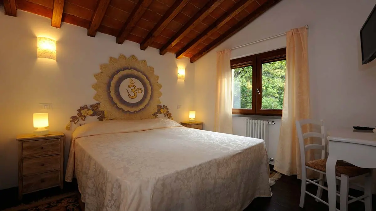 Ogni camera ha come tema un chakra o centro energetico, arredamento semplice, con armadio e ingresso privato, trattamento bed & breakfast con colazione a buffet.